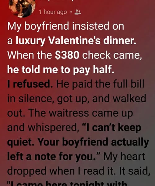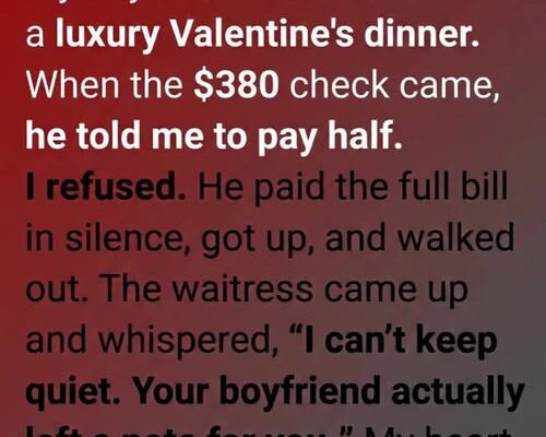 That evening, my boyfriend surprised me with a reservation at one of the most elegant restaurants in the city. It wasn’t our usual style. Soft violin music drifted through the air. Candles flickered against crisp white tablecloths. Crystal glasses caught the light like tiny stars.