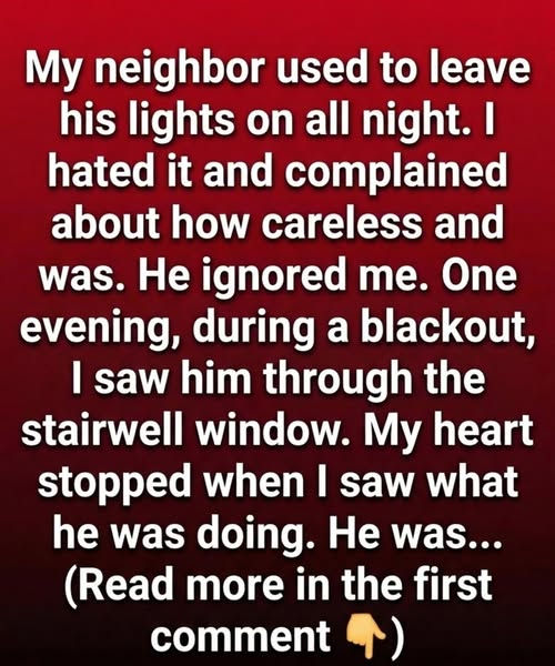 I complained more than once—politely at first, then with sharper words. Electricity wasn’t free. Darkness was normal. Why did he need his apartment blazing until dawn?